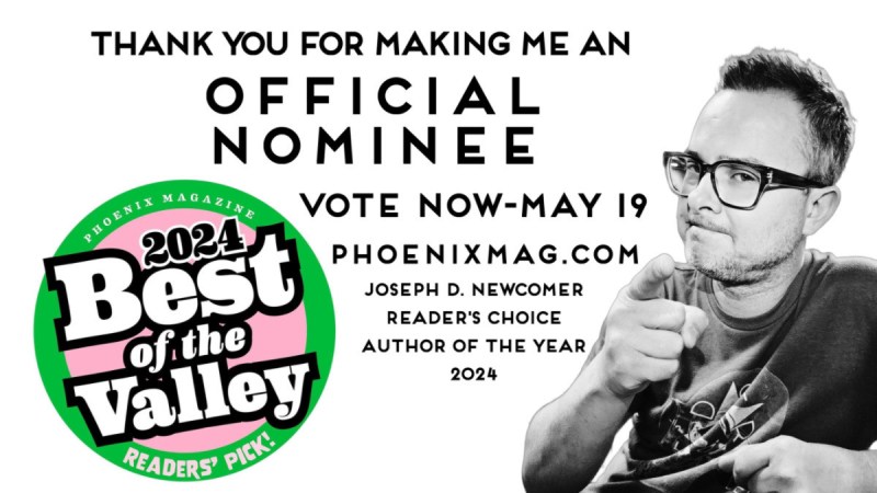 Also, in case you missed it, I was nominated for Phoenix Magazine Best of the Valley Reader’s Choice Author of the Year for the second year in a row. Voting has started, and you can vote once a day until May 19. All of your votes helped me win it last year, and I it would mean the world to my writing and to my indie publishing company if you’d take a moment each day to help me win one more time. Click on the Best of the Valley image to be taken to the voting page. It takes a second to load my name, but it’ll show up. See you at the signings.