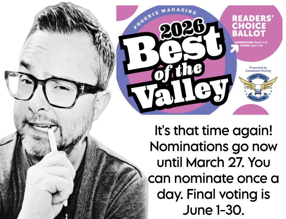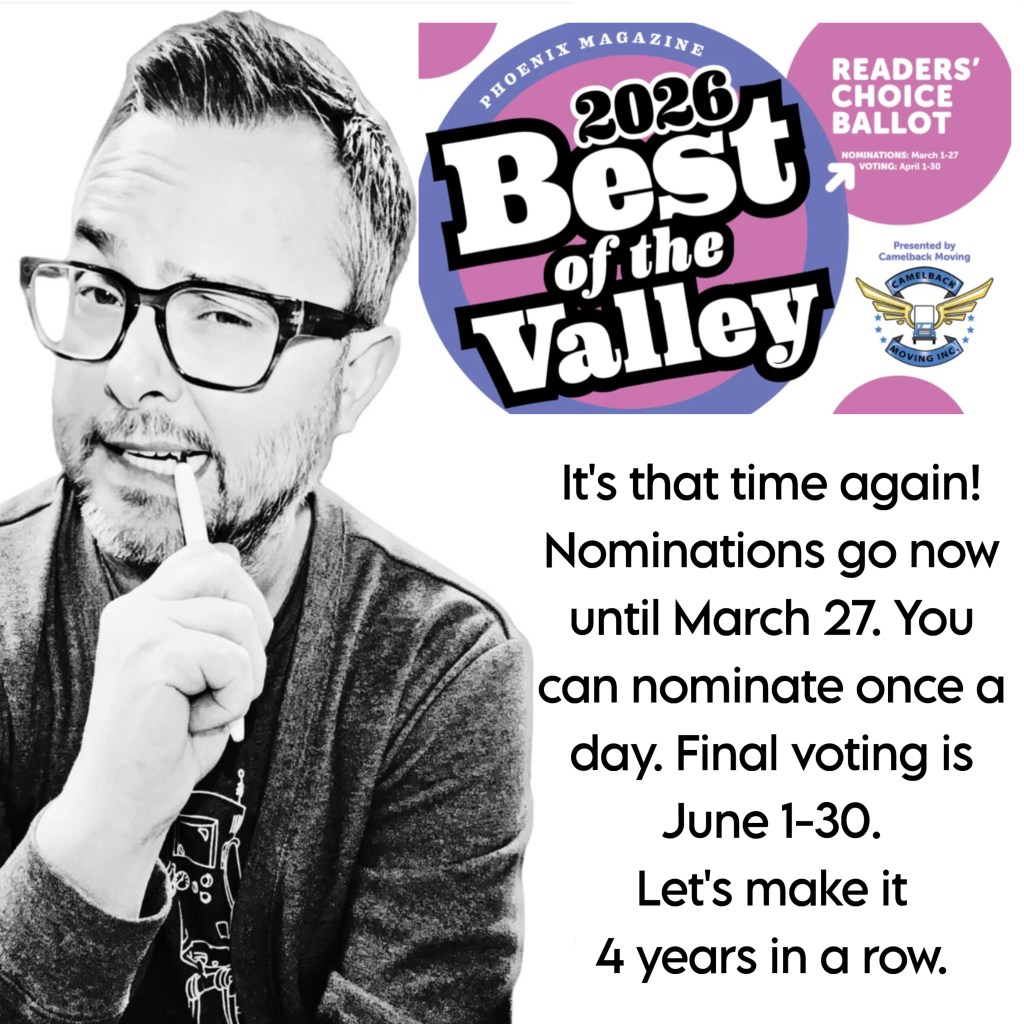 It’s that time of year again. The Phoenix Magazine Best of the Valley Reader’s Choice nominations are now open. If you’d like to help me win my 4th year in a row, you can nominate once a day until March 27, then you can vote once a day from June 1-30. Just check out the link below, type Joseph D. Newcomer into the Author field, and hit Nominate. You’ll have to answer a few questions and prove you’re not a robot. (If you are a robot, just let me know, and I’ll help you get through the captcha…your secret is safe with me.)