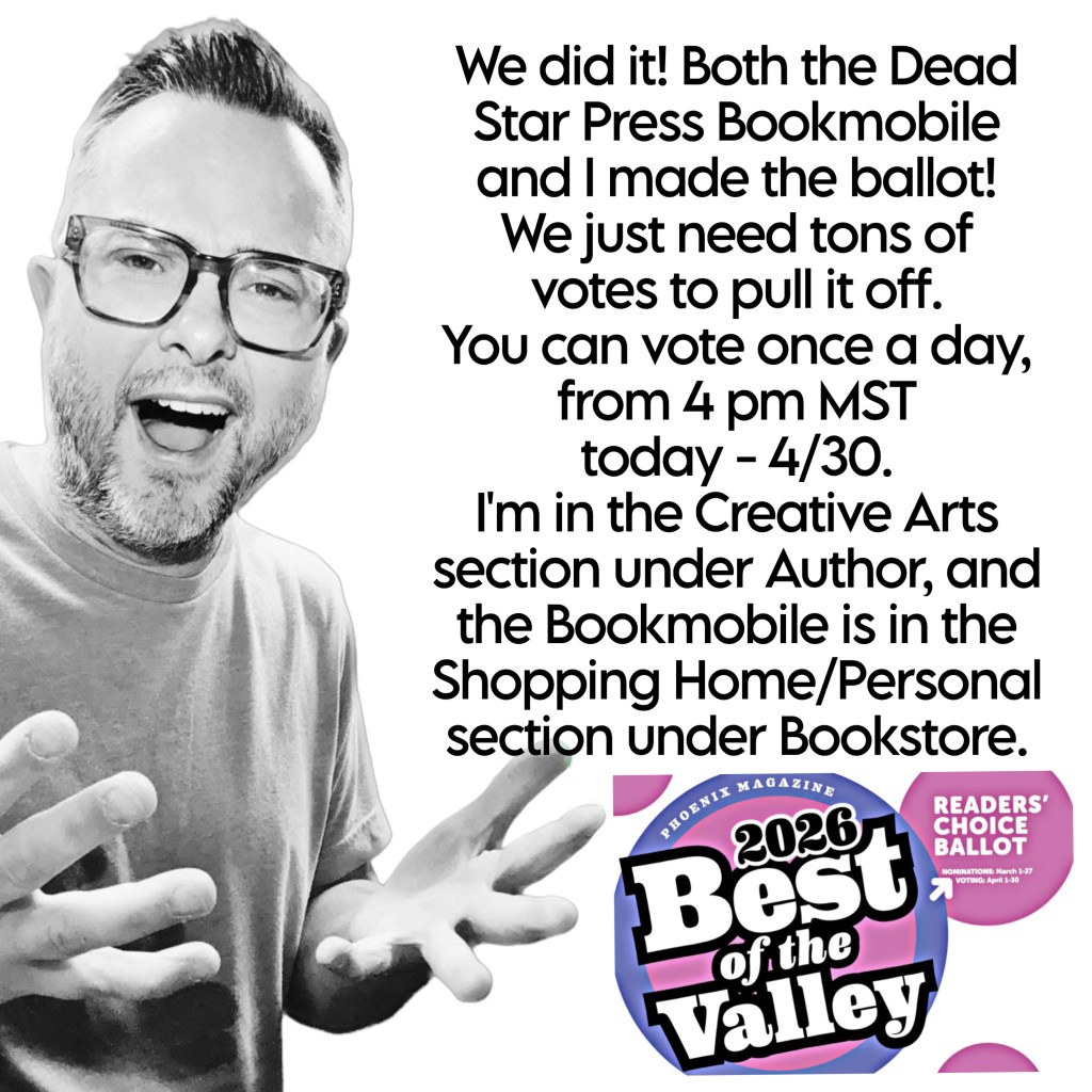 Once more, you made it happen, but this year is twice as sweet. Both the Dead Star Press Bookmobile and I made the Phoenix Magazine’s Reader’s Choice ballot!