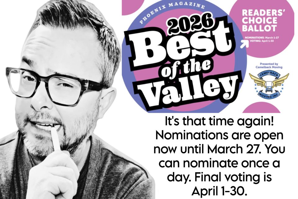 The Phoenix Magazine Best of the Valley Reader's Choice nominations are now open. If you'd like to help me win my 4th year in a row, you can nominate once a day until March 27.